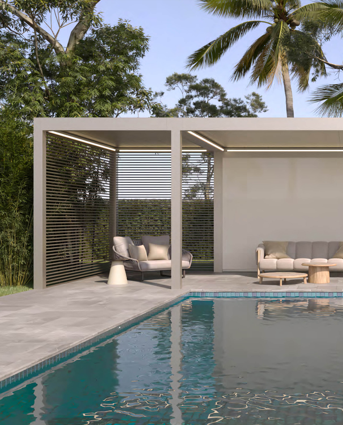 Hệ mái che thông minh tự động, điều khiển linh hoạt. Thiết kế tối ưu che nắng – mưa, giúp kiểm soát ánh sáng và nhiệt độ hiệu quả.