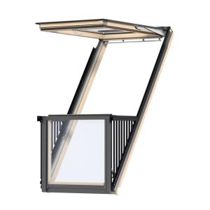 Cửa mái ban công Velux (Velux Roof Balcony) là hệ cửa mái thông minh có khả năng chuyển đổi từ cửa sổ mái sang ban công chỉ bằng thao tác mở cửa. Khi đóng lại, sản phẩm hoạt động như một cửa sổ mái thông thường; khi mở ra, phần dưới sẽ mở rộng thành ban công với lan can kính hai bên.