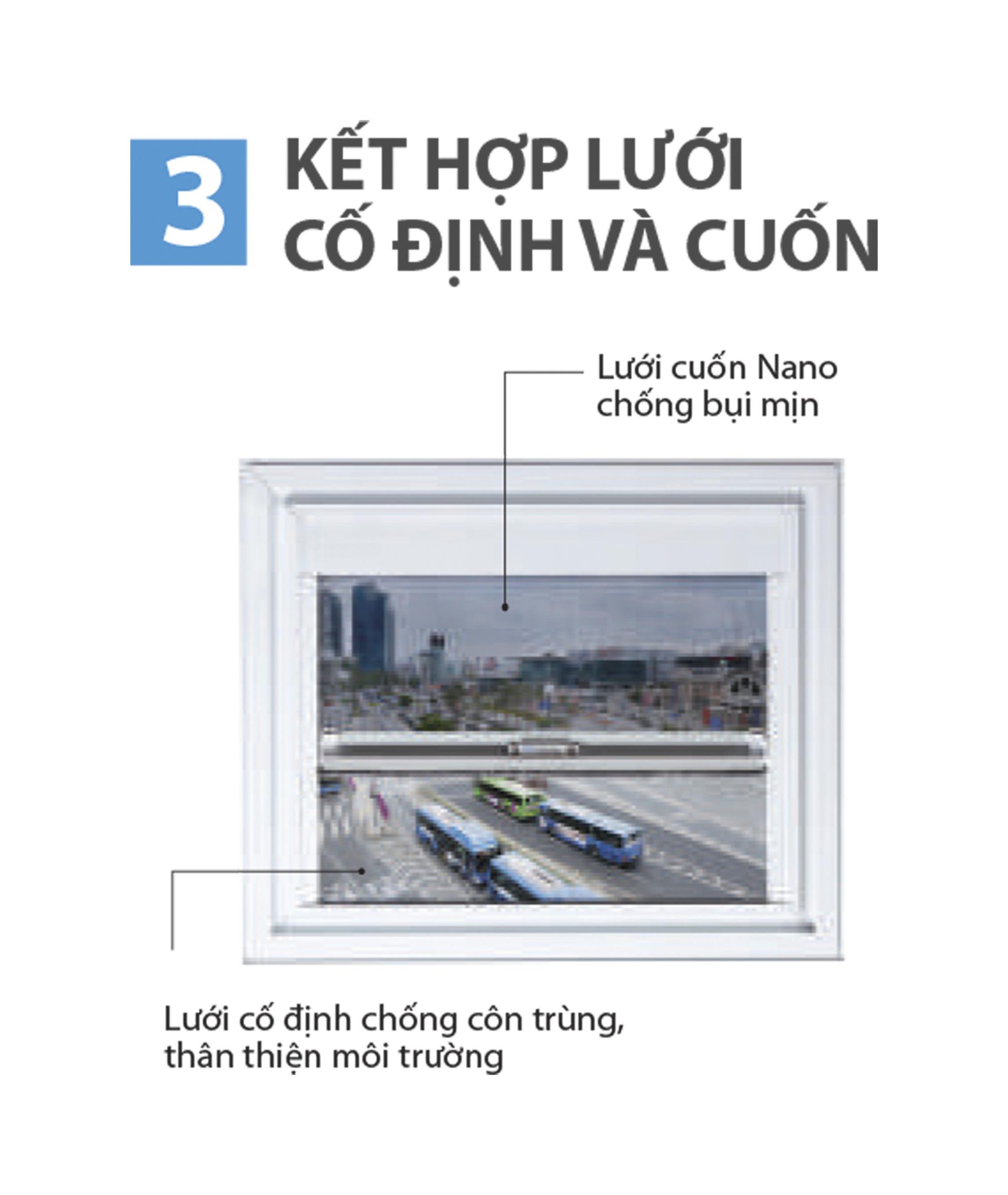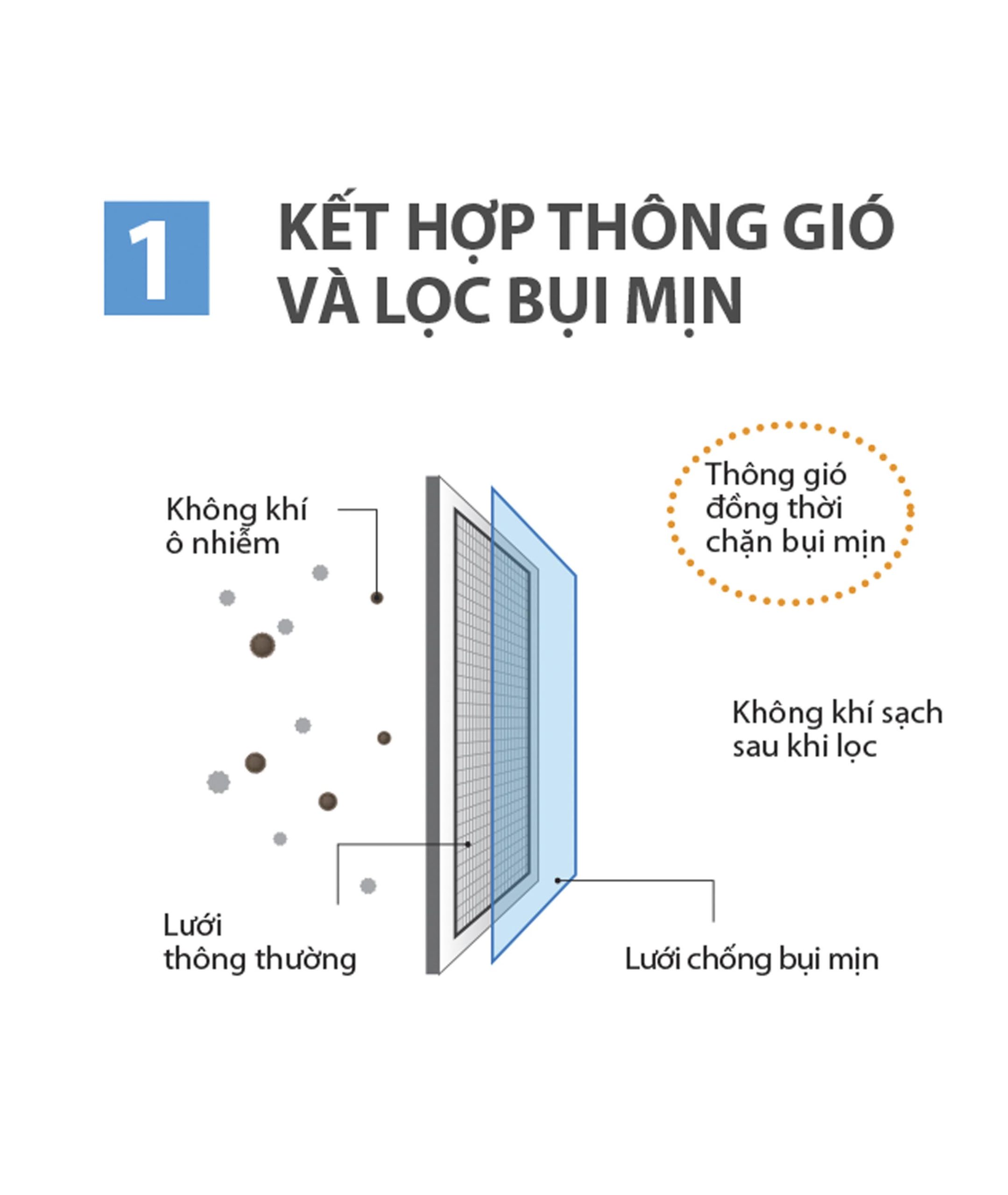 Điểm khác biệt của phiên bản chống bụi nằm ở cấu trúc lưới mật độ cao (fine mesh), cho phép cản phần lớn bụi mịn, phấn hoa và côn trùng nhỏ, trong khi vẫn duy trì luồng không khí lưu thông tự nhiên. Đây là lựa chọn lý tưởng cho các khu vực gần đường lớn, khu dân cư đông đúc hoặc những gia đình có trẻ nhỏ, người lớn tuổi.