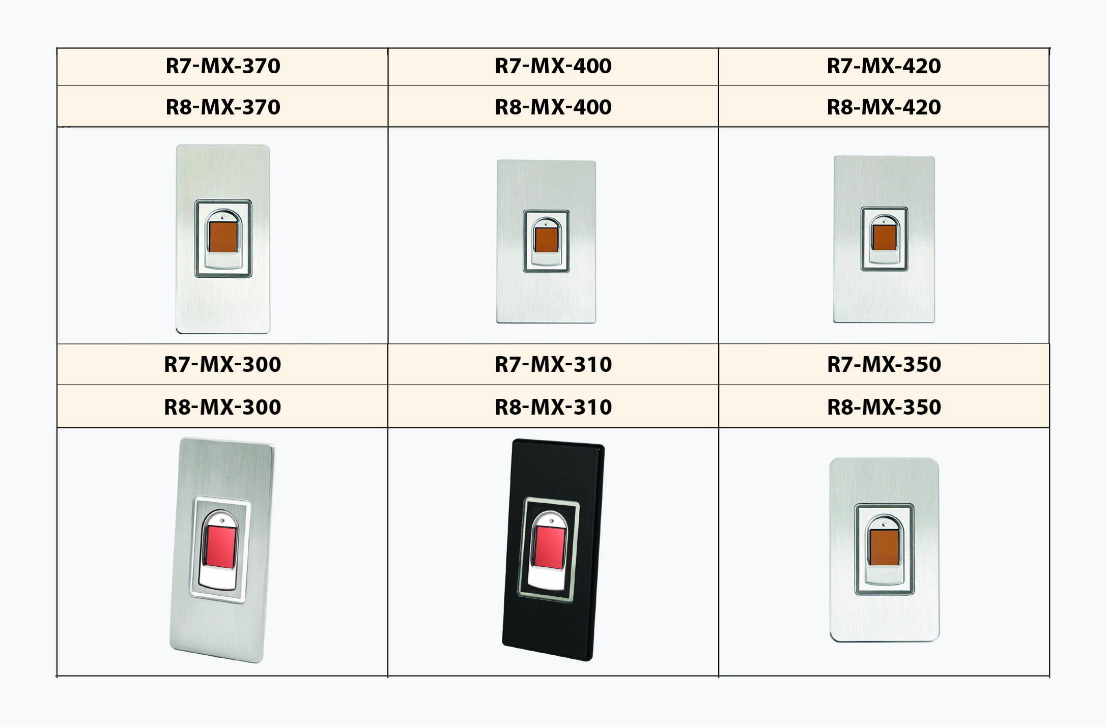 MX-200 / MX-210 / MX-300 / MX-310: Các biến thể đi kèm rozet hoặc khung bằng thép không gỉ hoặc nhôm, với kích thước khác nhau để phù hợp mọi kiểu tay nắm và mặt bàn thiết bị.