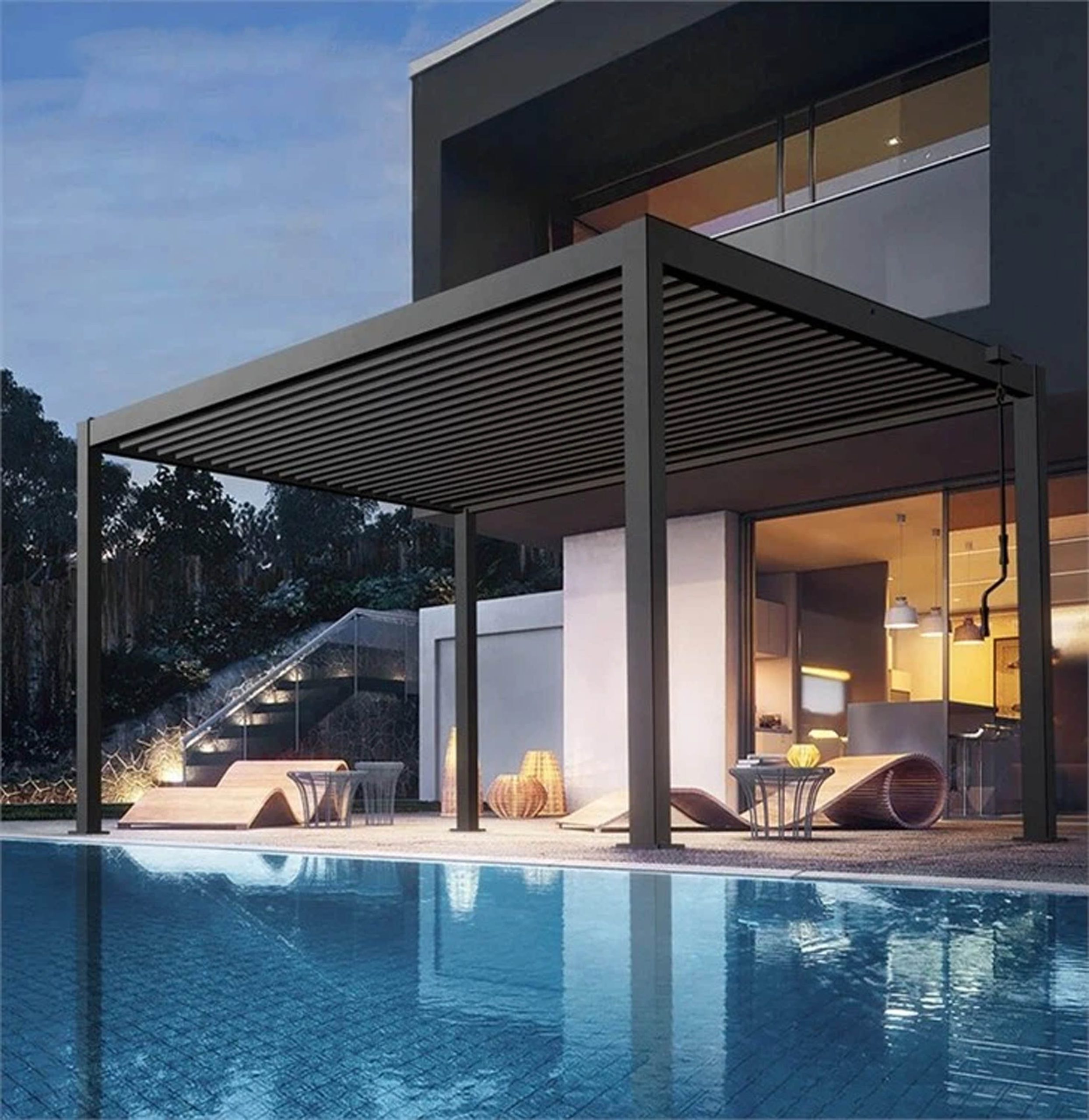 Pergola còn được trang bị nhiều tiện ích nâng cao như hệ thống đèn LED trang trí, quạt tích hợp đèn năng lượng mặt trời, máy sưởi ngoài trời hay hệ thống âm thanh – màn chiếu giải trí. Những yếu tố này không chỉ gia tăng tiện nghi mà còn biến không gian ngoài trời thành một khu vực sinh hoạt đa chức năng, phù hợp cho cả nhu cầu gia đình lẫn kinh doanh. Với thiết kế hiện đại, độ bền cao và khả năng tùy biến đa dạng, Pergola không chỉ nâng cao chất lượng cuộc sống mà còn góp phần gia tăng giá trị thẩm mỹ và giá trị bất động sản cho công trình.
