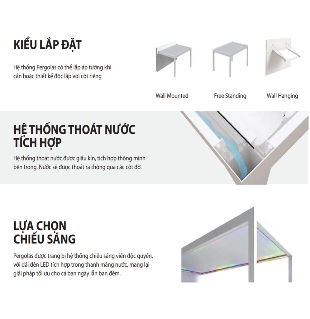 Pergola là giải pháp mái che ngoài trời hiện đại được thiết kế tối ưu để thích nghi với điều kiện khí hậu nhiệt đới như tại Việt Nam. Nhờ kết cấu nhôm cao cấp kết hợp hệ mái kín và thoát nước thông minh, sản phẩm có khả năng chống nắng, chống mưa và chịu gió hiệu quả, giúp không gian luôn khô ráo, thoáng mát và bền bỉ theo thời gian. Không chỉ đóng vai trò che chắn, Pergola còn góp phần tạo nên một không gian sống mở, nơi người dùng có thể thư giãn, tiếp khách hoặc tận hưởng thiên nhiên ngay tại sân vườn, sân thượng hay khu vực hồ bơi.