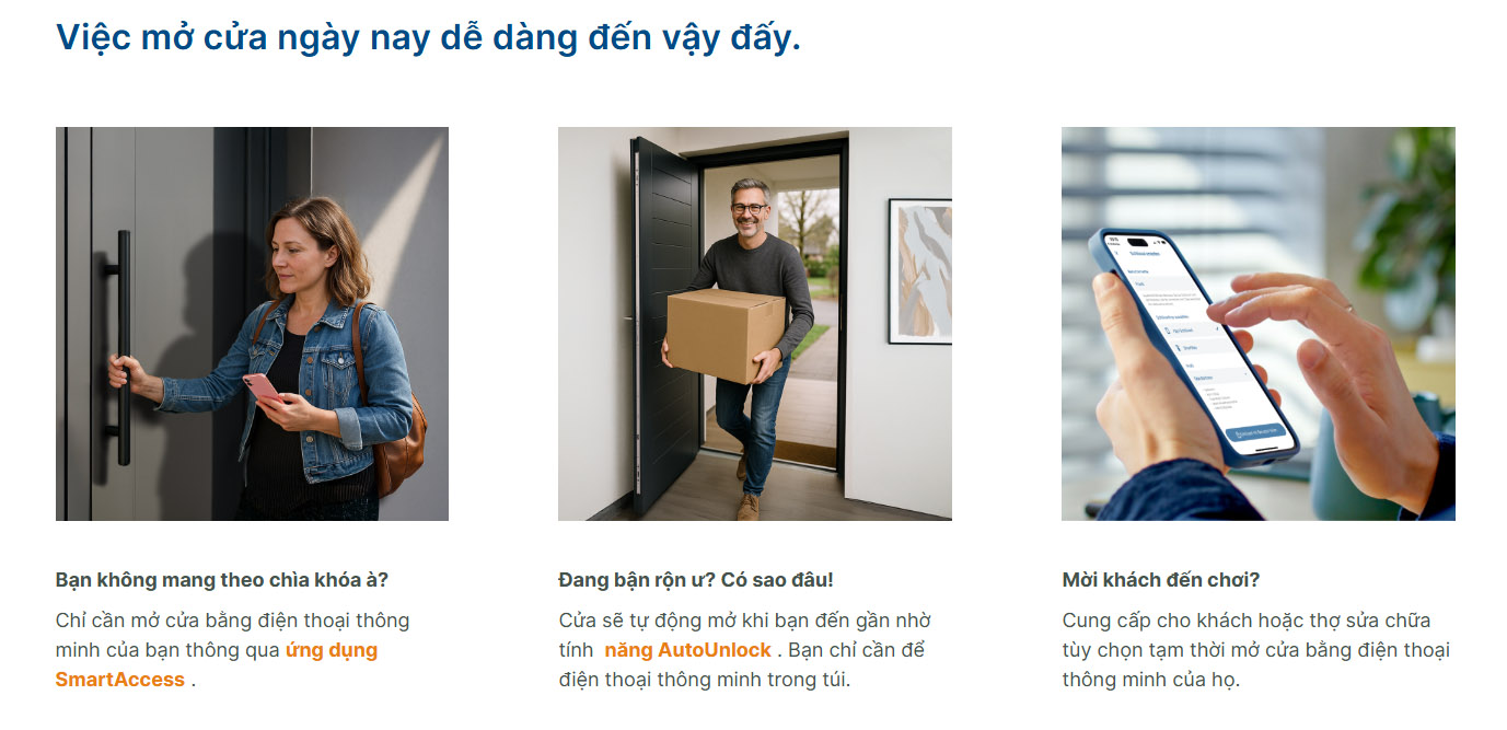 SmartAccess kết hợp công nghệ Bluetooth hiện đại, bảo mật cao và khả năng quản lý truy cập linh hoạt, mang lại trải nghiệm mở cửa tiện lợi, an toàn và phù hợp với nhiều loại cửa khác nhau như cửa nhà ở, biệt thự, văn phòng hay công trình cao cấp.