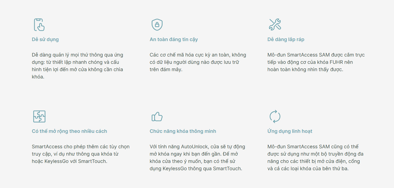Nhờ thiết kế lắp đặt ẩn trong cửa, không cần Internet và khả năng nâng cấp dễ dàng, SmartAccess đang trở thành một trong những giải pháp Smart Lock chuyên nghiệp hàng đầu cho hệ thống khóa motor FUHR.